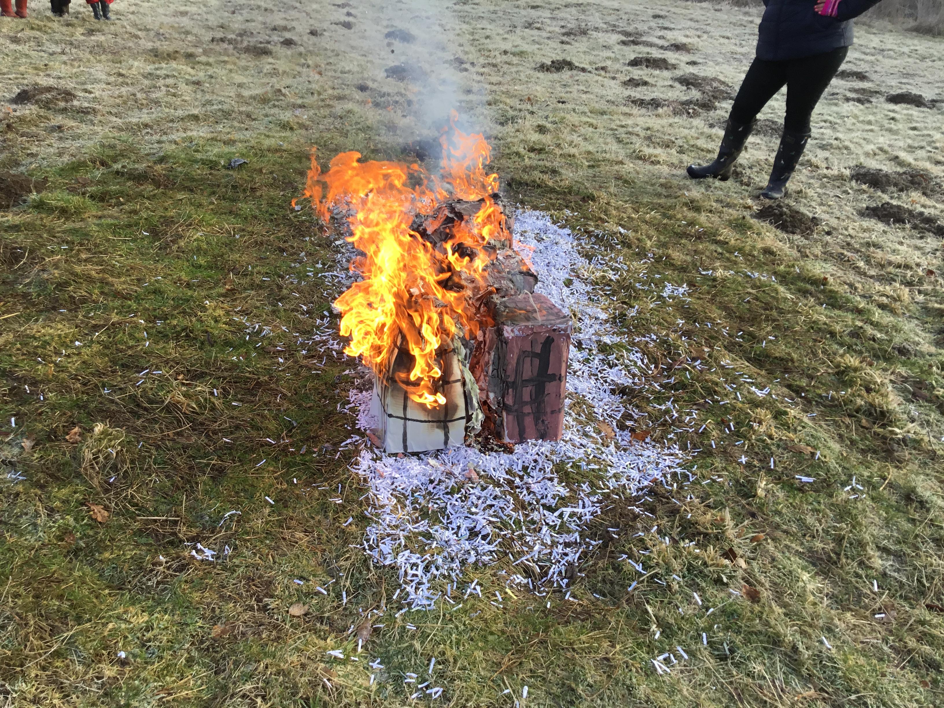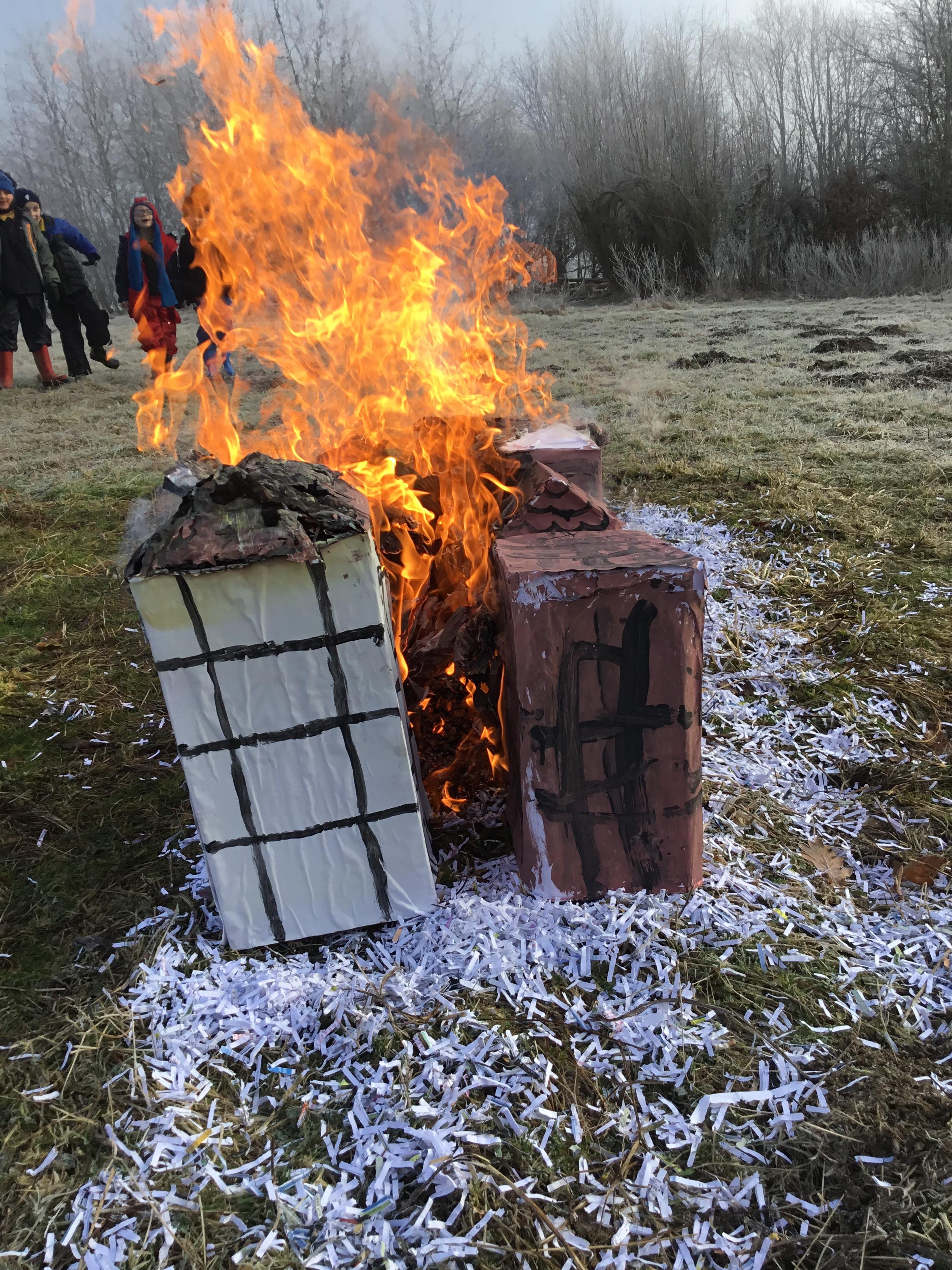 8th February 2023. In History we have been finding out all about The Great Fire of London. We made some houses from cardboard then set them up close together as they would have been in London. The best bit is that we set fire to them to watch how they would have burned!
